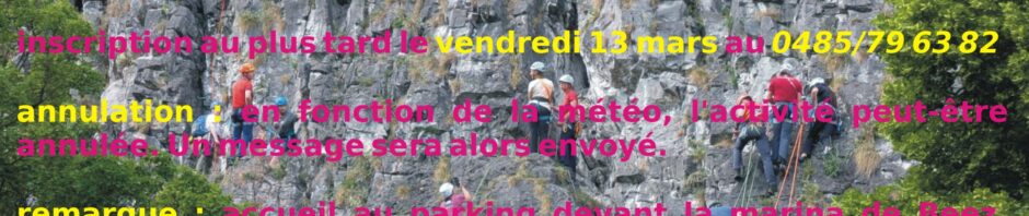 remarque : accueil au parking devant la marina de Beez, posséder son équipement personnel. Les cordées seront constituées sur place. Il n’y a pas d’obligation de grimper en tête. Ce n’est pas un stage.
